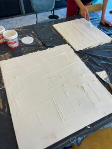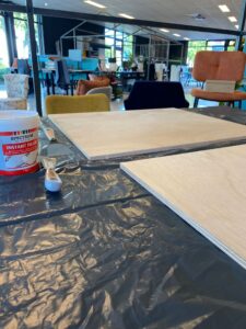 Verdeel het vulmiddel over de houten platen heen en strijk dit glad met het plamuurmes.
