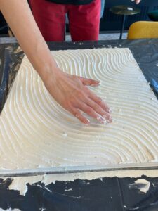 Je kan de bochten op verschillende manieren maken. Wij hebben onze vingers hiervoor gebruikt waardoor je dunne bochten krijgt. Werk in schuine lijnen van ongeveer hoek naar hoek.